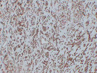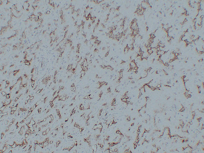 | Immunohistochemical analysis of paraffin-embedded Hemangioendothelioma. 1, Antibody was diluted at 1:200(4°,overnight). 2, Citric acid ,pH6.0 was used for antigen retrieval. |