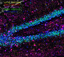 | Immunofluorescent analysis of paraformaldehyde-fixed rat hippocampus using NeuN (GB11138) (green) + IBA-1 (GB12105) (red) +MBP (GB12226) (spred) + GFAP (GB11096) (yellow) and Dapi in blue at dilution of 1:1000 |