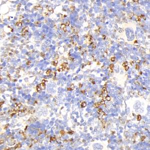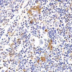 IHC检测Macrophage Inflammatory Protein 1 alpha/CCL3蛋白(货号 GB113793). 样品: 小鼠脾, 4%多聚甲醛 (货号G1101) 固定12-24小时. 抗原修复: 柠檬酸抗原修复液(干粉, pH 6.0) (G1201), 98℃, 20分钟. —抗: 1: 1000稀释, 4℃ 孵育过夜. 二抗: HRP标记山羊抗兔IgG (H+L) (货号GB23303), 1: 200稀释, 室温孵育1小时. |