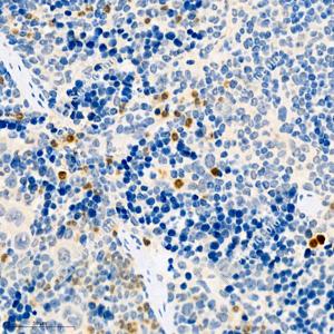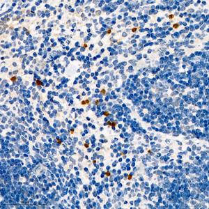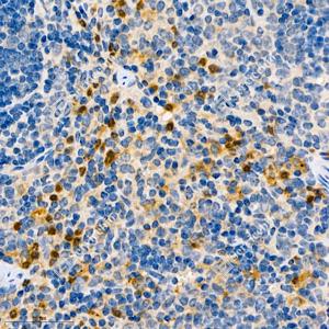 IHC检测Macrophage Inflammatory Protein 1 alpha/CCL3蛋白(货号 GB111212). 样品: 小鼠脾, 4%多聚甲醛 (货号G1101) 固定12-24小时. 抗原修复: 柠檬酸抗原修复液(干粉, pH 6.0) (G1201), 98℃, 20分钟. —抗: 1: 1000稀释, 4℃ 孵育过夜. 二抗: HRP标记山羊抗兔IgG (H+L) (货号GB23303), 1: 200稀释, 室温孵育1小时. |