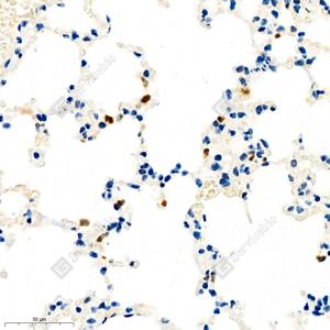IHC检测Macrophage Inflammatory Protein 1 alpha/CCL3蛋白(货号 GB111212). 样品: 小鼠肺炎, 4%多聚甲醛 (货号G1101) 固定12-24小时. 抗原修复: 柠檬酸抗原修复液(干粉, pH 6.0) (G1201), 98℃, 20分钟. —抗: 1: 1000稀释, 4℃ 孵育过夜. 二抗: HRP标记山羊抗兔IgG (H+L) (货号GB23303), 1: 200稀释, 室温孵育1小时. |