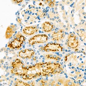 IHC检测Macrophage Inflammatory Protein 1 alpha/CCL3蛋白(货号 GB12687). 样品: 大鼠肾炎, 4%多聚甲醛 (货号G1101) 固定12-24小时. 抗原修复: 柠檬酸抗原修复液(干粉, pH 6.0) (G1201), 高压锅均匀喷气计时2分钟. —抗: 1: 500稀释, 4℃ 孵育过夜. 二抗: HRP标记山羊抗小鼠IgG (H+L) (货号GB23301), 1: 200稀释, 室温孵育1小时. |