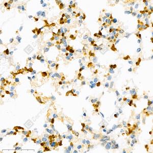 IHC检测Macrophage Inflammatory Protein 1 alpha/CCL3蛋白(货号 GB12687). 样品: 小鼠肺炎, 4%多聚甲醛 (货号G1101) 固定12-24小时. 抗原修复: 柠檬酸抗原修复液(干粉, pH 6.0) (G1201), 高压锅均匀喷气计时2分钟. —抗: 1: 2000稀释, 4℃ 孵育过夜. 二抗: HRP标记山羊抗小鼠IgG (H+L) (货号GB23301), 1: 200稀释, 室温孵育1小时. |