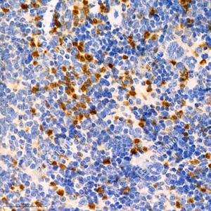 IHC检测Macrophage Inflammatory Protein 1 alpha/CCL3蛋白(货号 GB12687). 样品: 小鼠脾炎, 4%多聚甲醛 (货号G1101) 固定12-24小时. 抗原修复: 柠檬酸抗原修复液(干粉, pH 6.0) (G1201), 高压锅均匀喷气计时2分钟. —抗: 1: 2000稀释, 4℃ 孵育过夜. 二抗: HRP标记山羊抗小鼠IgG (H+L) (货号GB23301), 1: 200稀释, 室温孵育1小时. |
