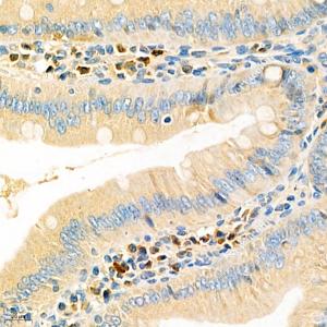 IHC检测Macrophage Inflammatory Protein 1 alpha/CCL3蛋白(货号 GB12687). 样品: 大鼠肠炎, 4%多聚甲醛 (货号G1101) 固定12-24小时. 抗原修复: 柠檬酸抗原修复液(干粉, pH 6.0) (G1201), 高压锅均匀喷气计时2分钟. —抗: 1: 500稀释, 4℃ 孵育过夜. 二抗: HRP标记山羊抗小鼠IgG (H+L) (货号GB23301), 1: 200稀释, 室温孵育1小时. |