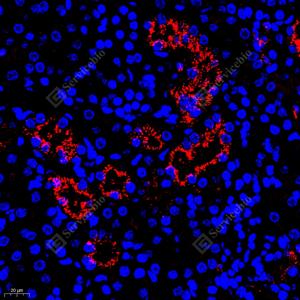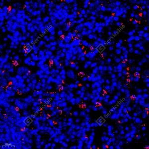 IF检测Macrophage Inflammatory Protein 1 alpha/CCL3蛋白(货号 GB12687)(红色). 样品: 小鼠肾炎, 4%多聚甲醛 (货号G1101) 固定12-24小时. 抗原修复: 柠檬酸抗原修复液(干粉, pH 6.0) (G1201), 高压锅均匀喷气计时2分钟. 封闭: 3% BSA(货号GC305010)的PBS溶液, 室温孵育30分钟. —抗: 1: 500稀释, 4℃ 孵育过夜. 二抗: Cy3标记山羊抗小鼠IgG (H+L) (货号GB21301), 1: 300稀释, 室温孵育1小时. |