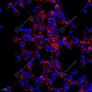 IF检测Macrophage Inflammatory Protein 1 alpha/CCL3蛋白(货号 GB12687)(红色). 样品: 小鼠肺炎, 4%多聚甲醛 (货号G1101) 固定12-24小时. 抗原修复: 柠檬酸抗原修复液(干粉, pH 6.0) (G1201), 高压锅均匀喷气计时2分钟. 封闭: 3% BSA(货号GC305010)的PBS溶液, 室温孵育30分钟. —抗: 1: 500稀释, 4℃ 孵育过夜. 二抗: Cy3标记山羊抗小鼠IgG (H+L) (货号GB21301), 1: 300稀释, 室温孵育1小时. |
