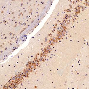IHC检测BCA1蛋白(货号 GB11919). 样品: 大鼠小脑, 4%多聚甲醛 (货号G1101) 固定12-24小时. 抗原修复: 柠檬酸抗原修复液(干粉, pH 6.0) (G1201), 98℃, 20分钟. —抗: 1: 2000稀释, 4℃ 孵育过夜. 二抗: HRP标记山羊抗兔IgG (H+L) (货号GB23303), 1: 200稀释, 室温孵育1小时. |
