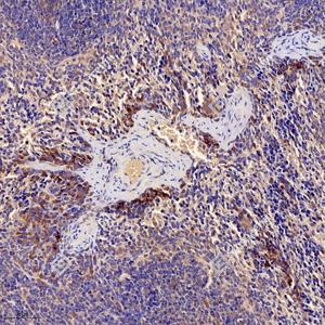 IHC检测BCA1蛋白(货号 GB11919). 样品: 小鼠脾, 4%多聚甲醛 (货号G1101) 固定12-24小时. 抗原修复: 柠檬酸抗原修复液(干粉, pH 6.0) (G1201), 98℃, 20分钟. —抗: 1: 2000稀释, 4℃ 孵育过夜. 二抗: HRP标记山羊抗兔IgG (H+L) (货号GB23303), 1: 200稀释, 室温孵育1小时. |