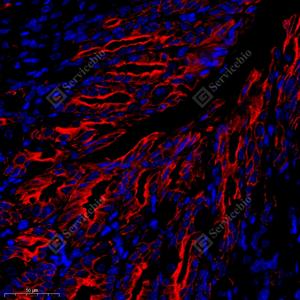 IF检测BCA1蛋白(货号 GB11919)(红色). 样品: 小鼠胃, 4%多聚甲醛 (货号G1101) 固定12-24小时. 抗原修复: Tris-EDTA抗原修复液(pH 9.0) (G1203), 98℃, 20分钟. 封闭: 3% BSA(货号GC305010)的PBS溶液, 室温孵育30分钟. —抗: 1: 1000稀释, 4℃ 孵育过夜. 二抗: Cy3标记山羊抗兔IgG (H+L) (货号GB21303), 1: 300稀释, 室温孵育1小时. |