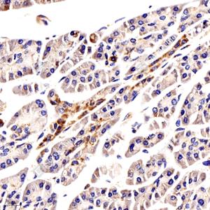 IHC检测MCP 1蛋白(货号 GB11199). 样品: 人胃癌, 4%多聚甲醛 (货号G1101) 固定12-24小时. 抗原修复: 柠檬酸抗原修复液(干粉, pH 6.0) (G1201), 98℃, 20分钟. —抗: 1: 500稀释, 4℃ 孵育过夜. 二抗: HRP标记山羊抗兔IgG (H+L) (货号GB23303), 1: 200稀释, 室温孵育1小时. |