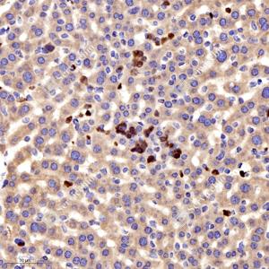 IHC检测MCP 1蛋白(货号 GB11199). 样品: 小鼠肝, 4%多聚甲醛 (货号G1101) 固定12-24小时. 抗原修复: 柠檬酸抗原修复液(干粉, pH 6.0) (G1201), 98℃, 20分钟. —抗: 1: 500稀释, 4℃ 孵育过夜. 二抗: HRP标记山羊抗兔IgG (H+L) (货号GB23303), 1: 200稀释, 室温孵育1小时. |