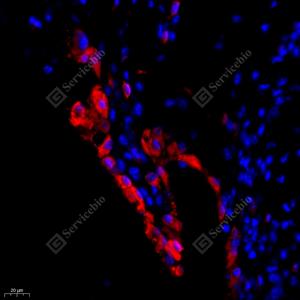 IF检测MCP 1蛋白(货号 GB11199)(红色). 样品: 小鼠膝盖, 4%多聚甲醛 (货号G1101) 固定12-24小时. 抗原修复: Tris-EDTA抗原修复液(pH 9.0) (G1203), 98℃, 20分钟. 封闭: 3% BSA(货号GC305010)的PBS溶液, 室温孵育30分钟. —抗: 1: 500稀释, 4℃ 孵育过夜. 二抗: Cy3标记山羊抗兔IgG (H+L) (货号GB21303), 1: 300稀释, 室温孵育1小时. |