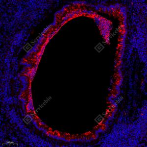 IF检测MCP 1蛋白(货号 GB11199)(红色). 样品: 大鼠肺, 4%多聚甲醛 (货号G1101) 固定12-24小时. 抗原修复: Tris-EDTA抗原修复液(pH 9.0) (G1203), 98℃, 20分钟. 封闭: 3% BSA(货号GC305010)的PBS溶液, 室温孵育30分钟. —抗: 1: 500稀释, 4℃ 孵育过夜. 二抗: Cy3标记山羊抗兔IgG (H+L) (货号GB21303), 1: 300稀释, 室温孵育1小时. |