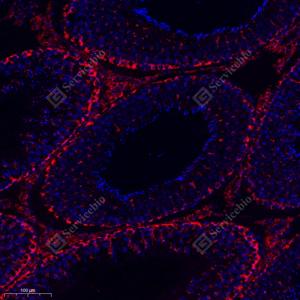 IF检测MCP 1蛋白(货号 GB11199)(红色). 样品: 大鼠睾丸, 4%多聚甲醛 (货号G1101) 固定12-24小时. 抗原修复: Tris-EDTA抗原修复液(pH 9.0) (G1203), 98℃, 20分钟. 封闭: 3% BSA(货号GC305010)的PBS溶液, 室温孵育30分钟. —抗: 1: 500稀释, 4℃ 孵育过夜. 二抗: Cy3标记山羊抗兔IgG (H+L) (货号GB21303), 1: 300稀释, 室温孵育1小时. |