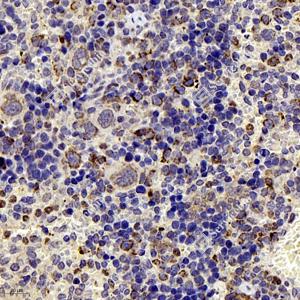 IHC检测CCR5蛋白(货号 GB11505). 样品: 大鼠脾, 4%多聚甲醛 (货号G1101) 固定12-24小时. 抗原修复: 柠檬酸抗原修复液(干粉, pH 6.0) (G1201), 98℃, 20分钟. —抗: 1: 500稀释, 4℃ 孵育过夜. 二抗: HRP标记山羊抗兔IgG (H+L) (货号GB23303), 1: 200稀释, 室温孵育1小时. |