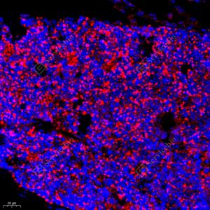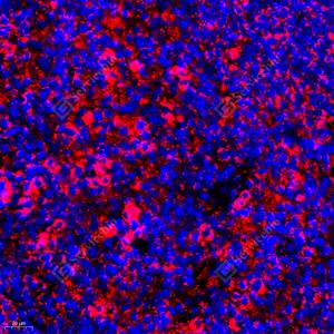 IF检测CCR5蛋白(货号 GB11505)(红色). 样品: 小鼠脾, 4%多聚甲醛 (货号G1101) 固定12-24小时. 抗原修复: Tris-EDTA抗原修复液(pH 9.0) (G1203), 98℃, 20分钟. 封闭: 3% BSA(货号GC305010)的PBS溶液, 室温孵育30分钟. —抗: 1: 500稀释, 4℃ 孵育过夜. 二抗: Cy3标记山羊抗兔IgG (H+L) (货号GB21303), 1: 300稀释, 室温孵育1小时. |