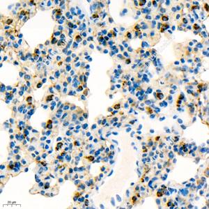 | IHC检测CX3CR1蛋白(货号 GB11861). 样品: 大鼠肺炎, 4%多聚甲醛 (货号G1101) 固定12-24小时. 抗原修复: 柠檬酸抗原修复液(干粉, pH 6.0) (G1201), 98℃, 20分钟. —抗: 1: 1000稀释, 4℃ 孵育过夜. 二抗: HRP标记山羊抗兔IgG (H+L) (货号GB23303), 1: 200稀释, 室温孵育1小时. |