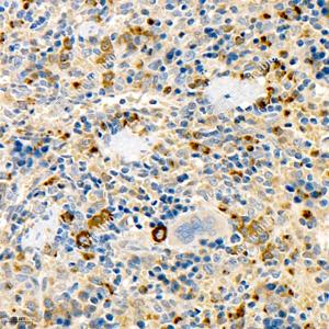 | IHC检测CX3CR1蛋白(货号 GB11861). 样品: 大鼠脾, 4%多聚甲醛 (货号G1101) 固定12-24小时. 抗原修复: 柠檬酸抗原修复液(干粉, pH 6.0) (G1201), 98℃, 20分钟. —抗: 1: 1000稀释, 4℃ 孵育过夜. 二抗: HRP标记山羊抗兔IgG (H+L) (货号GB23303), 1: 200稀释, 室温孵育1小时. |