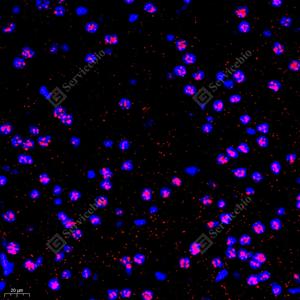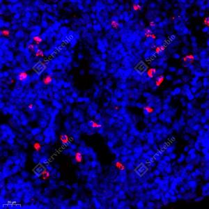| IF检测CX3CR1蛋白(货号 GB11861)(红色). 样品: 小鼠脾, 4%多聚甲醛 (货号G1101) 固定12-24小时. 抗原修复: Tris-EDTA抗原修复液(pH 9.0) (G1203), 98℃, 20分钟. 封闭: 3% BSA(货号GC305010)的PBS溶液, 室温孵育30分钟. —抗: 1: 3000稀释, 4℃ 孵育过夜. 二抗: Cy3标记山羊抗兔IgG (H+L) (货号GB21303), 1: 300稀释, 室温孵育1小时. |