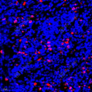 | IF检测CX3CR1蛋白(货号 GB11861)(红色). 样品: 大鼠淋巴结, 4%多聚甲醛 (货号G1101) 固定12-24小时. 抗原修复: Tris-EDTA抗原修复液(pH 9.0) (G1203), 98℃, 20分钟. 封闭: 3% BSA(货号GC305010)的PBS溶液, 室温孵育30分钟. —抗: 1: 3000稀释, 4℃ 孵育过夜. 二抗: Cy3标记山羊抗兔IgG (H+L) (货号GB21303), 1: 300稀释, 室温孵育1小时. |