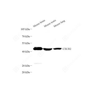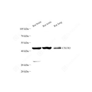 WB检测CXCR2蛋白(货号 GB115557). 样品: 经RIPA裂解液(货号G2002)处理的蛋白质. 封闭: 封闭: 3%脱脂牛奶(货号GC310001)溶于TBST溶液, 室温孵育1小时. —抗: 1: 300稀释, 4℃ 孵育过夜. 二抗: HRP标记山羊抗兔IgG (H+L) (货号GB23303), 1: 5000稀释, 室温孵育1小时. |