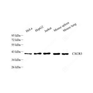 WB检测CXCR3蛋白(货号 GB11659). 样品: 经RIPA裂解液(货号G2002)处理的蛋白质. 封闭: 封闭: 3%脱脂牛奶(货号GC310001)溶于TBST溶液, 室温孵育1小时. —抗: 1: 1000稀释, 4℃ 孵育过夜. 二抗: HRP标记山羊抗兔IgG (H+L) (货号GB23303), 1: 5000稀释, 室温孵育1小时. |