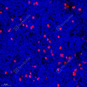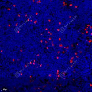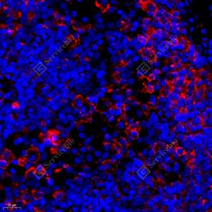 IF检测MCP5蛋白(货号 GB112194)(红色). 样品: 小鼠淋巴结, 4%多聚甲醛 (货号G1101) 固定12-24小时. 抗原修复: Tris-EDTA抗原修复液(pH 9.0) (G1203), 98℃, 20分钟. 封闭: 3% BSA(货号GC305010)的PBS溶液, 室温孵育30分钟. —抗: 1: 400稀释, 4℃ 孵育过夜. 二抗: Cy3标记山羊抗兔IgG (H+L) (货号GB21303), 1: 300稀释, 室温孵育1小时. |