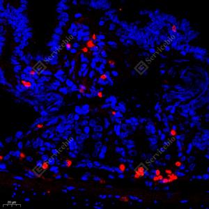 IF检测MCP5蛋白(货号 GB112194)(红色). 样品: 小鼠小肠+脂多糖, 4%多聚甲醛 (货号G1101) 固定12-24小时. 抗原修复: Tris-EDTA抗原修复液(pH 9.0) (G1203), 98℃, 20分钟. 封闭: 3% BSA(货号GC305010)的PBS溶液, 室温孵育30分钟. —抗: 1: 1200稀释, 4℃ 孵育过夜. 二抗: Cy3标记山羊抗兔IgG (H+L) (货号GB21303), 1: 300稀释, 室温孵育1小时. |