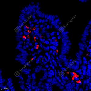 IF检测MCP5蛋白(货号 GB112194)(红色). 样品: 小鼠小肠, 4%多聚甲醛 (货号G1101) 固定12-24小时. 抗原修复: Tris-EDTA抗原修复液(pH 9.0) (G1203), 98℃, 20分钟. 封闭: 3% BSA(货号GC305010)的PBS溶液, 室温孵育30分钟. —抗: 1: 400稀释, 4℃ 孵育过夜. 二抗: Cy3标记山羊抗兔IgG (H+L) (货号GB21303), 1: 300稀释, 室温孵育1小时. |