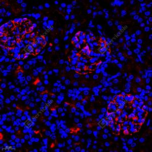 IF检测MCP5蛋白(货号 GB112194)(红色). 样品: 大鼠肾, 4%多聚甲醛 (货号G1101) 固定12-24小时. 抗原修复: Tris-EDTA抗原修复液(pH 9.0) (G1203), 98℃, 20分钟. 封闭: 3% BSA(货号GC305010)的PBS溶液, 室温孵育30分钟. —抗: 1: 400稀释, 4℃ 孵育过夜. 二抗: Cy3标记山羊抗兔IgG (H+L) (货号GB21303), 1: 300稀释, 室温孵育1小时. |