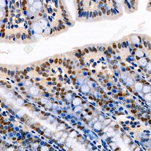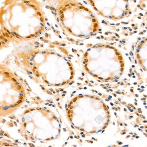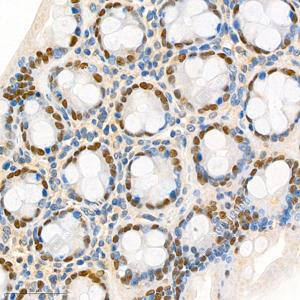 IHC检测SATB2蛋白(货号 GB111449). 样品: 小鼠结肠, 4%多聚甲醛 (货号G1101) 固定12-24小时. 抗原修复: 柠檬酸抗原修复液(干粉, pH 6.0) (G1201), 98℃, 20分钟. —抗: 1: 1500稀释, 4℃ 孵育过夜. 二抗: HRP标记山羊抗兔IgG (H+L) (货号GB23303), 1: 200稀释, 室温孵育1小时. |