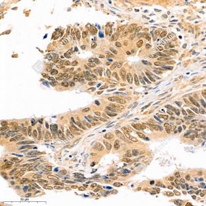 IHC检测SATB2蛋白(货号 GB111449). 样品: 人结肠癌, 4%多聚甲醛 (货号G1101) 固定12-24小时. 抗原修复: 柠檬酸抗原修复液(干粉, pH 6.0) (G1201), 98℃, 20分钟. —抗: 1: 1500稀释, 4℃ 孵育过夜. 二抗: HRP标记山羊抗兔IgG (H+L) (货号GB23303), 1: 200稀释, 室温孵育1小时. |