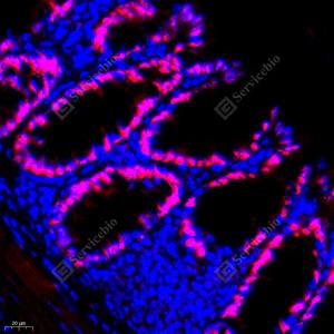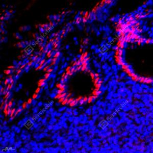 IF检测SATB2蛋白(货号 GB111449)(红色). 样品: 小鼠结肠, 4%多聚甲醛 (货号G1101) 固定12-24小时. 抗原修复: Tris-EDTA抗原修复液(pH 9.0) (G1203), 98℃, 20分钟. 封闭: 3% BSA(货号GC305010)的PBS溶液, 室温孵育30分钟. —抗: 1: 1500稀释, 4℃ 孵育过夜. 二抗: Cy3标记山羊抗兔IgG (H+L) (货号GB21303), 1: 300稀释, 室温孵育1小时. |