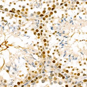 IHC检测CBX1/HP1 beta蛋白(货号 GB111291). 样品: 小鼠睾丸, 4%多聚甲醛 (货号G1101) 固定12-24小时. 抗原修复: Tris-EDTA抗原修复液(pH 9.0) (G1203), 98℃, 20分钟. —抗: 1: 1600稀释, 4℃ 孵育过夜. 二抗: HRP标记山羊抗兔IgG (H+L) (货号GB23303), 1: 200稀释, 室温孵育1小时. |