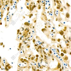 IHC检测CBX1/HP1 beta蛋白(货号 GB111291). 样品: 大鼠胎盘, 4%多聚甲醛 (货号G1101) 固定12-24小时. 抗原修复: Tris-EDTA抗原修复液(pH 9.0) (G1203), 98℃, 20分钟. —抗: 1: 1600稀释, 4℃ 孵育过夜. 二抗: HRP标记山羊抗兔IgG (H+L) (货号GB23303), 1: 200稀释, 室温孵育1小时. |