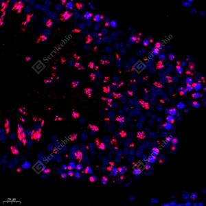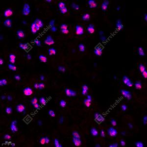 IF检测CBX1/HP1 beta蛋白(货号 GB111291)(红色). 样品: 小鼠胎盘, 4%多聚甲醛 (货号G1101) 固定12-24小时. 抗原修复: Tris-EDTA抗原修复液(pH 9.0) (G1203), 98℃, 20分钟. 封闭: 3% BSA(货号GC305010)的PBS溶液, 室温孵育30分钟. —抗: 1: 1600稀释, 4℃ 孵育过夜. 二抗: Cy3标记山羊抗兔IgG (H+L) (货号GB21303), 1: 300稀释, 室温孵育1小时. |
