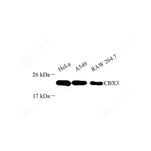The family of Heterochromatin protein 1 (HP1) proteins is a family of highly conserved heterochromatin-associated non-histone chromosomal proteins , which has important functions in nucleus. These functions include gene activation or repression, regulation of binding of cohesion complexes to centromere, sequestration of genes to nuclear periphery, and heterochromatin formation and propagation. Much evidence shows that HP1 proteins interact with numerous proteins including methylated histones, histone methyltransferases and so on. CBX3 is one of the paralogues of HP1 proteins.