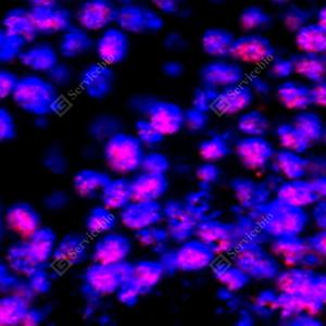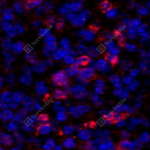 IF检测SIRT1蛋白(货号 GB11512)(红色). 样品: 小鼠脾, 4%多聚甲醛 (货号G1101) 固定12-24小时. 抗原修复: Tris-EDTA抗原修复液(pH 9.0) (G1203), 98℃, 20分钟. 封闭: 3% BSA(货号GC305010)的PBS溶液, 室温孵育30分钟. —抗: 1: 500稀释, 4℃ 孵育过夜. 二抗: Cy3标记山羊抗兔IgG (H+L) (货号GB21303), 1: 300稀释, 室温孵育1小时. |