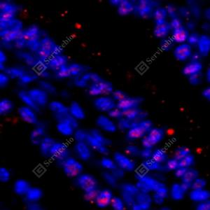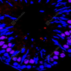 IF检测SIRT1蛋白(货号 GB11512)(红色). 样品: 大鼠睾丸, 4%多聚甲醛 (货号G1101) 固定12-24小时. 抗原修复: Tris-EDTA抗原修复液(pH 9.0) (G1203), 98℃, 20分钟. 封闭: 3% BSA(货号GC305010)的PBS溶液, 室温孵育30分钟. —抗: 1: 500稀释, 4℃ 孵育过夜. 二抗: Cy3标记山羊抗兔IgG (H+L) (货号GB21303), 1: 300稀释, 室温孵育1小时. |