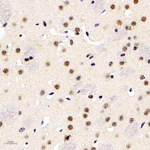 IHC检测MGMT蛋白(货号 GB11380). 样品: 小鼠脑, 4%多聚甲醛 (货号G1101) 固定12-24小时. 抗原修复: 柠檬酸抗原修复液(干粉, pH 6.0) (G1201), 98℃, 20分钟. —抗: 1: 300稀释, 4℃ 孵育过夜. 二抗: HRP标记山羊抗兔IgG (H+L) (货号GB23303), 1: 200稀释, 室温孵育1小时. |