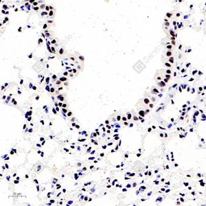 IHC检测MGMT蛋白(货号 GB11380). 样品: 小鼠肺, 4%多聚甲醛 (货号G1101) 固定12-24小时. 抗原修复: 柠檬酸抗原修复液(干粉, pH 6.0) (G1201), 98℃, 20分钟. —抗: 1: 300稀释, 4℃ 孵育过夜. 二抗: HRP标记山羊抗兔IgG (H+L) (货号GB23303), 1: 200稀释, 室温孵育1小时. |