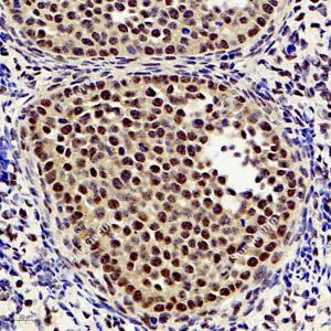 IHC检测MGMT蛋白(货号 GB11380). 样品: 小鼠卵巢, 4%多聚甲醛 (货号G1101) 固定12-24小时. 抗原修复: 柠檬酸抗原修复液(干粉, pH 6.0) (G1201), 98℃, 20分钟. —抗: 1: 300稀释, 4℃ 孵育过夜. 二抗: HRP标记山羊抗兔IgG (H+L) (货号GB23303), 1: 200稀释, 室温孵育1小时. |