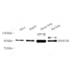 WB检测Dnmt3b蛋白(货号 GB112020). 样品: 经RIPA裂解液(货号G2002)处理的蛋白质. 封闭: 封闭: 3%脱脂牛奶(货号GC310001)溶于TBST溶液, 室温孵育1小时. —抗: 1: 500稀释, 4℃ 孵育过夜. 二抗: HRP标记山羊抗兔IgG (H+L) (货号GB23303), 1: 5000稀释, 室温孵育1小时. |