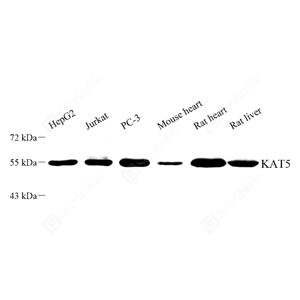 KAT5, also named as The histone acetyltransferase (HAT) Tat interactive protein 60 kD belongs to the MYST protein family that contains atypical zinc finger and histone acetyltransferase domains. Also, KAT5 contains a chromodomain. KAT5 is a catalytic subunit of the NuA4 histone acetyltransferase complex. The NuA4 HAT complex plays a role in transcriptional activation of select genes mainly by acetylation of nucleosomal histone H4 and H2A, which influence nucleosome-DNA interaction and promotes interaction of the modified histones with other proteins that could regulate transcription positively.