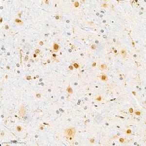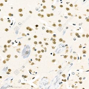 IHC检测KAT5/Tip60蛋白(货号 GB111964). 样品: 大鼠脑, 4%多聚甲醛 (货号G1101) 固定12-24小时. 抗原修复: Tris-EDTA抗原修复液(pH 9.0) (G1203), 98℃, 20分钟. —抗: 1: 400稀释, 4℃ 孵育过夜. 二抗: HRP标记山羊抗兔IgG (H+L) (货号GB23303), 1: 200稀释, 室温孵育1小时. |