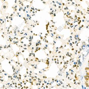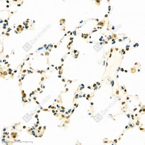 IHC检测KAT5/Tip60蛋白(货号 GB111964). 样品: 小鼠肺, 4%多聚甲醛 (货号G1101) 固定12-24小时. 抗原修复: Tris-EDTA抗原修复液(pH 9.0) (G1203), 98℃, 20分钟. —抗: 1: 400稀释, 4℃ 孵育过夜. 二抗: HRP标记山羊抗兔IgG (H+L) (货号GB23303), 1: 200稀释, 室温孵育1小时. |