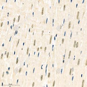 IHC检测KAT5/Tip60蛋白(货号 GB111964). 样品: 大鼠心, 4%多聚甲醛 (货号G1101) 固定12-24小时. 抗原修复: Tris-EDTA抗原修复液(pH 9.0) (G1203), 98℃, 20分钟. —抗: 1: 400稀释, 4℃ 孵育过夜. 二抗: HRP标记山羊抗兔IgG (H+L) (货号GB23303), 1: 200稀释, 室温孵育1小时. |