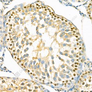 IHC检测KAT5/Tip60蛋白(货号 GB111964). 样品: 大鼠睾丸, 4%多聚甲醛 (货号G1101) 固定12-24小时. 抗原修复: Tris-EDTA抗原修复液(pH 9.0) (G1203), 98℃, 20分钟. —抗: 1: 400稀释, 4℃ 孵育过夜. 二抗: HRP标记山羊抗兔IgG (H+L) (货号GB23303), 1: 200稀释, 室温孵育1小时. |