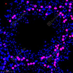 IF检测KAT5/Tip60蛋白(货号 GB111964)(红色). 样品: 小鼠睾丸, 4%多聚甲醛 (货号G1101) 固定12-24小时. 抗原修复: Tris-EDTA抗原修复液(pH 9.0) (G1203), 98℃, 20分钟. 封闭: 3% BSA(货号GC305010)的PBS溶液, 室温孵育30分钟. —抗: 1: 400稀释, 4℃ 孵育过夜. 二抗: Cy3标记山羊抗兔IgG (H+L) (货号GB21303), 1: 300稀释, 室温孵育1小时. |